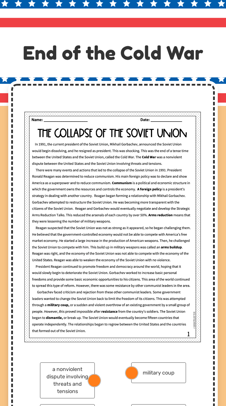 Lesson on end of cold war including Gorbachev's policies, fall of eastern bloc, end of warsaw pact and fall of soviet ... Resource type: Worksheet/Activity. Rating: 4.3 · 7 reviews · Free · In stock
