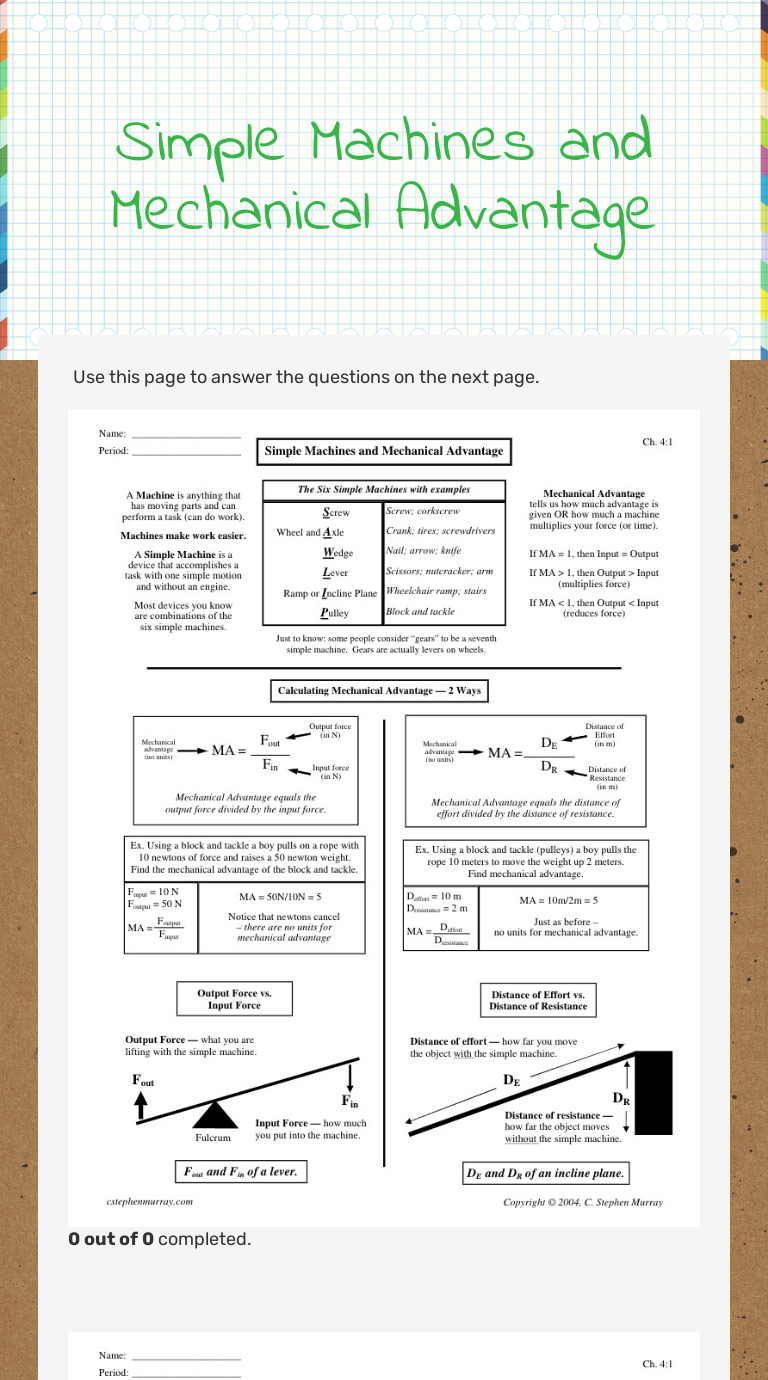 This chart includes diagrams of six simple machines: Download free worksheet · see in a lesson plan view answers. Work, efficiency and mechanical advantage calculations (a copy may be found here). 8th grade core packet (science, social studies, english/language arts, el).