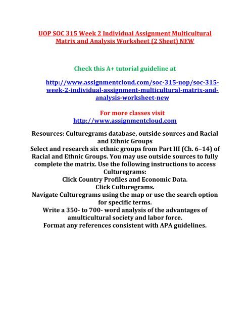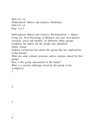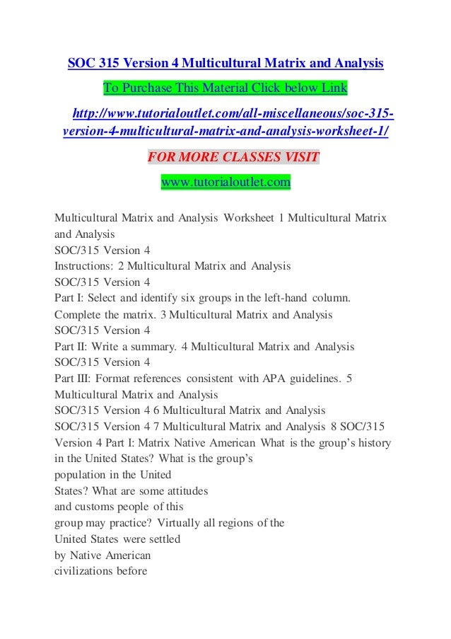Multicultural Matrix and Analysis SOC/315 Version 4 1 University of Phoenix Material Multicultural Matrix and Analysis Worksheet Instructions: Part I: Select and identify six groups in the left-hand column. Complete the matrix. Part II: Write a summary. Part III: Format references consistent with APA guidelines.