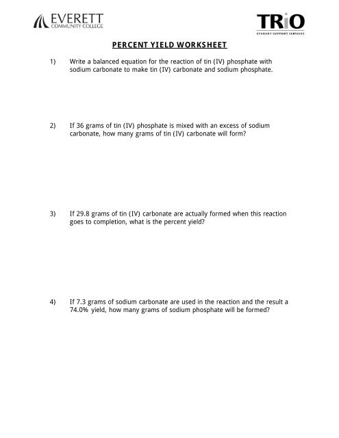 Inspiration Percent Yield Worksheet Answers - Goal … › Best education From www.goalkeepingintelligence.com. PERCENT YIELD WORKSHEET - SOLUTIONS 1 Write a balanced equation for the reaction of tin IV phosphate with sodium carbonate to make tin IV carbonate...