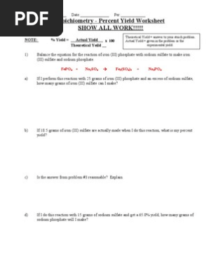 Theoretical and Percent Yield Worksheet Answers goes to completion, what is the percent yield? Percent Yield Worksheet - Ms. Mogck's Classroom Stoichiometry - Percent Yield Worksheet - Key 1) Write the equation for the reaction of iron (III) phosphate with sodium sulfate to make iron (III) sulfate...