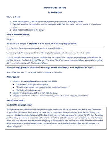 There will come soft rains. A worksheet to help students develop skills in writing about literature, with a focus on using PEE to analyse similes, metaphors, personification and irony. Based on the short story, 'There will come soft rains', by Ray Bradbury, from the anthology 'Stories of Ourselves' (Cambridge).
