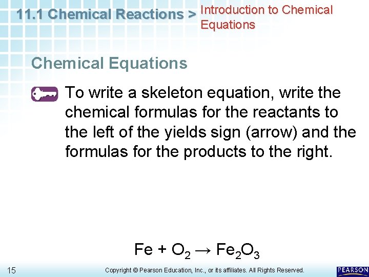 Although the chemical reactions involved in photosynthesis and digestion are different, both chemical reactions are necessary to sustain life. In a chemical reaction, one or more substances (the reactants) change into one or more new substances (the products). Figure 11.1a shows the ingredients for making leavened breadÑflour, salt, yeast, and water. You will predict the products of a chemical reaction when given the reactants and write a balanced chemical equation. Answers 1. Decomposition - 2 Hg. Chapter 11 Chemical Reactions 113. SECTION 11.1 DESCRIBING CHEMICAL REACTIONS (pages 321-329). This section explains how to write equations describing . Chemical Reactions. REACTIONS. 11.1 Describing Chemical Reactions. Chemical reactions are represented by balanced chemical equations. Lesson Summary. Introduction to Chemical Equations. A chemical equation uses symbols, and sometimes words, to show the reactants and products of a chemical reaction.