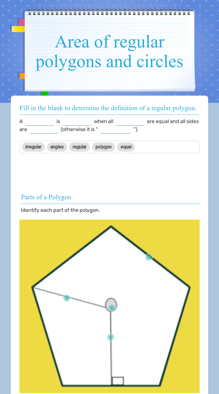 Some of the worksheets for this concept are 6 area of regular polygons, Area of regular and irregular polygons work, Perimeter of regular polygons work, Area of regular polygons 360, Area of a polygon 1, Chapter 12 area of polygons, Areas of regular polygons work answers, Areas of regular polygons work answers. Found worksheet you are looking for?