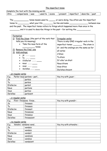 This worksheet allows students to use their knowledge of the Imperfect Tense to complete conjugation, translation and verb-finder tasks. As a Secondary teacher of French and Spanish, I put a great deal of effort into creating useful resources that are accessible for lower ability pupils as well...