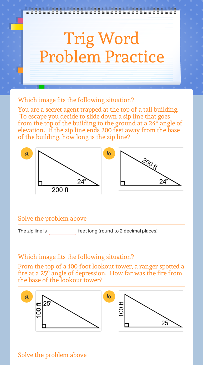 Angle of elevation depression trig worksheet draw and label a picture for each problem 1. Brian s kite is flying above a field at the end of 65 m of string. Brian s kite is flying above a field at the end of 65 m of string. Angle of elevation and depression answer key displaying top 8 worksheets found for this concept. Trigonometry word problems worksheet angle of elevation and depression 1 a ramp for unloading a moving truck has an angle of elevation of 30. The second boat must travel about 10 6 miles to get as far west as the first boat. 2444º 41 x solve for x. If the angle of elevation to the kite measures 70 how high is the kite above brian s head. Trig Unit Word Problems Angles of Elevation and Depression 1) A woman is standing on the ground at a point 78ft from the base of a building. The angle of elevation to the top of the building is 57 . To the nearest foot, how high is the building? 2) The sun shines on a flagpole, causing a shadow to be cast on the ground.