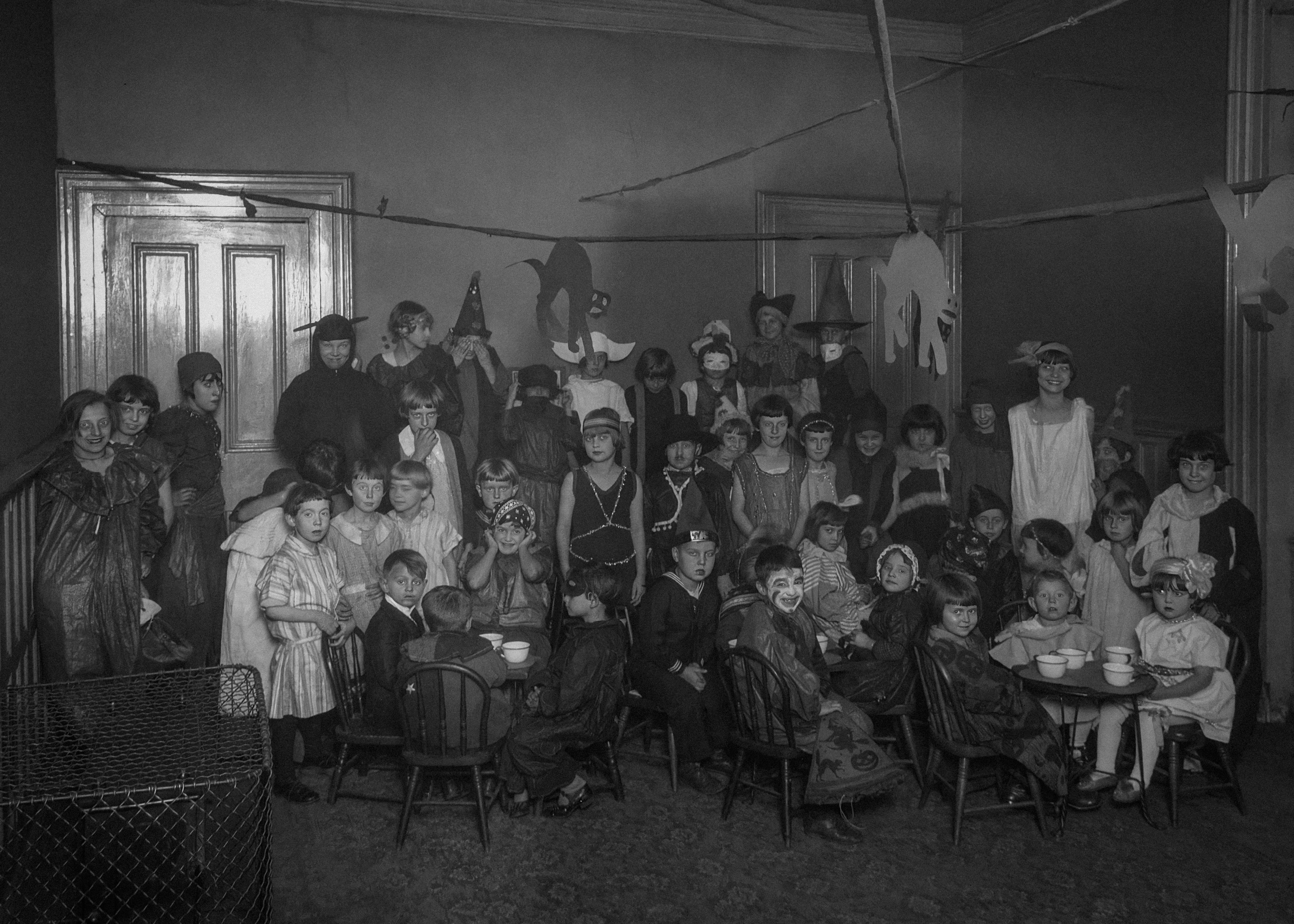 Caption reads, "Children Enjoy a Halloween Party at the Lewis Center. Photograph Taken for the Bureau of Recreation." Original black and white photograph by Pittsburgh City Photographer. Taken October 29th, 1925, Pittsburgh, Pennsylvania, United States (University of Pittsburgh). Remastered by Jordan J. Lloyd (@unseenhistories). The original scan can be found at the University of Pittsburgh, Pittsburgh City Photographer Collection â² https://historicpittsburgh.org/islandora/object/pitt%3A715.25948.CP â See it on Unseen Histories at â² https://www.unseenhistories.com/a-public-domain-halloween