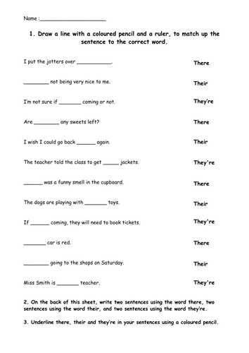 There, They're and Their Worksheet. I currently work at the top end of Primary school in Year 5/6. I create resources for a range of subjects and am always open to suggestions for resources people require. An activity sheet that focuses on being able to use there, their and they’re accurately. Included is key information at the top of the ...