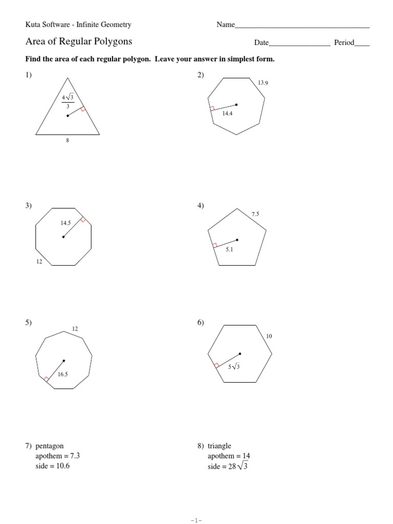 So, I re-vamped my mini unit over area of regular polygons from last year and I definitely saw some improvement in scores. I think next year, we decided as a team that we are going to include area of regular polygons into our area and perimeter unit. Day 1: We labeled the parts of regular triangles on our regular polygons graphic organizer. K Worksheet by Kuta Software LLC 9) 7-gon apothem = 21.8 side = 21 1602.3 10) octagon apothem = 14.1 side = 11.7 659.88 Use what you know about special right triangles to find the area of each regular polygon. Leave your answer in simplest form. 11) 18 243 3 12) 4 3 96 3 13) 10 25 3 14) 8 96 3 15) quadrilateral radius = 16 2 1024 16) hexagon side = 16 3 3 128 3