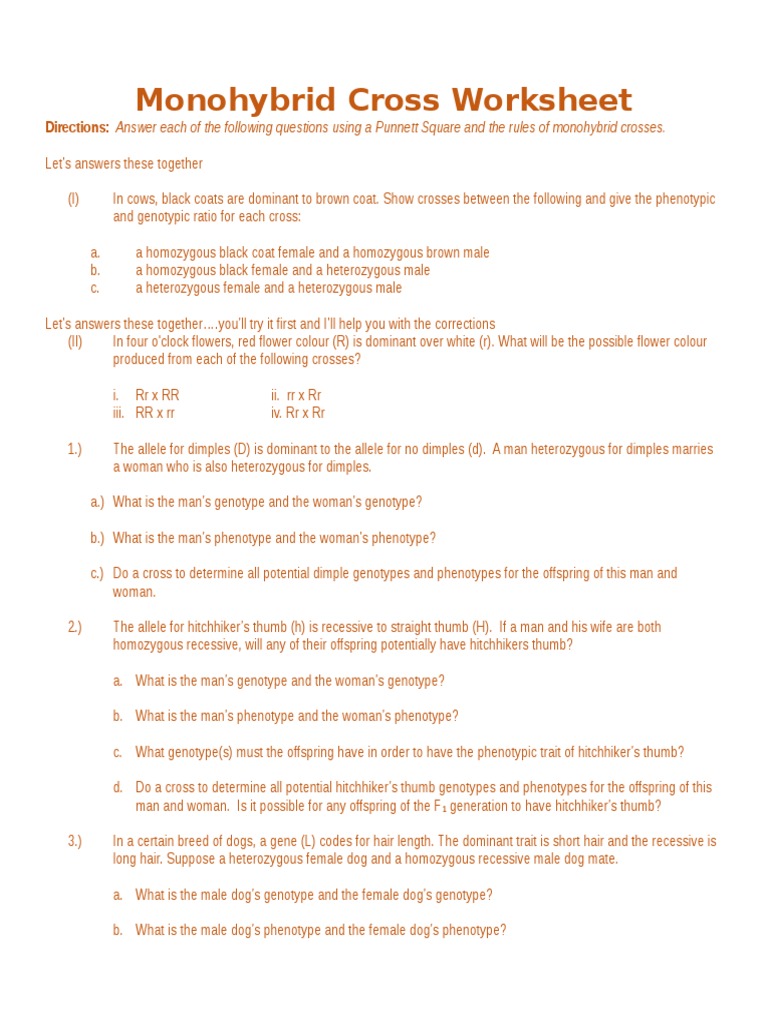 Monohybrid Cross Worksheet Directions: Answer each of the following questions using a Punnett Square and the rules of monohybrid crosses. 1.) The allele for dimples (D) is dominant to the allele for no dimples (d). A man heterozygous for dimples marries a woman who is also heterozygous for dimples. a.) Genetics Practice Problems 3 Monohybrid Problems Worksheet 1 Answers. Worksheet November 21, 2021 05:00. This is part of a series of articles on Genetics Practice Problems. Genetics Practice Problems, also known as the Genetics Practice Problems Number Three, is the third and final step in a process that leads to a Doctor of Medicine Degree.