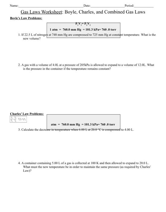 PDF Guilford County Schools / Homepage Gas Laws Worksheet #1 - Bo le's Charles' Ga -Lussac's and Combined Gas Law Solve all problems — you must show your work (including units). The correct answer is given in parentheses at the end of the problem. Boyle's Law 1. A as ple contained in a cylinder equipped with a moveable piston occupie 00.0 at a pressure