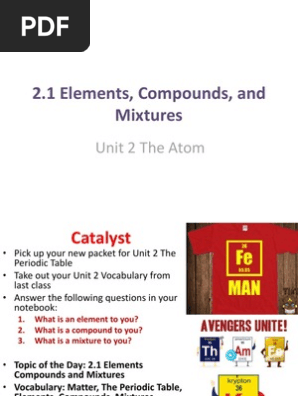 lesson-1-elements-compounds-and-mixtures-worksheet-answers... lesson-1-elements-compounds-and-mixtures-worksheet-answers - Elements, Compounds and Mixtures SNC2D 1. Classify lesson-1-elements-compounds-and-mixtures-worksheet-answers... School Polytechnic University of the Philippines. Course Title NASC 2054. Compound vs Element - Difference and Comparison | Diffen What's the difference between Compound and Element? Elements and compounds are pure chemical substances found in nature. The difference between an element and a compound is that an element is a substance made of same type of atoms, whereas a compound is made of different...