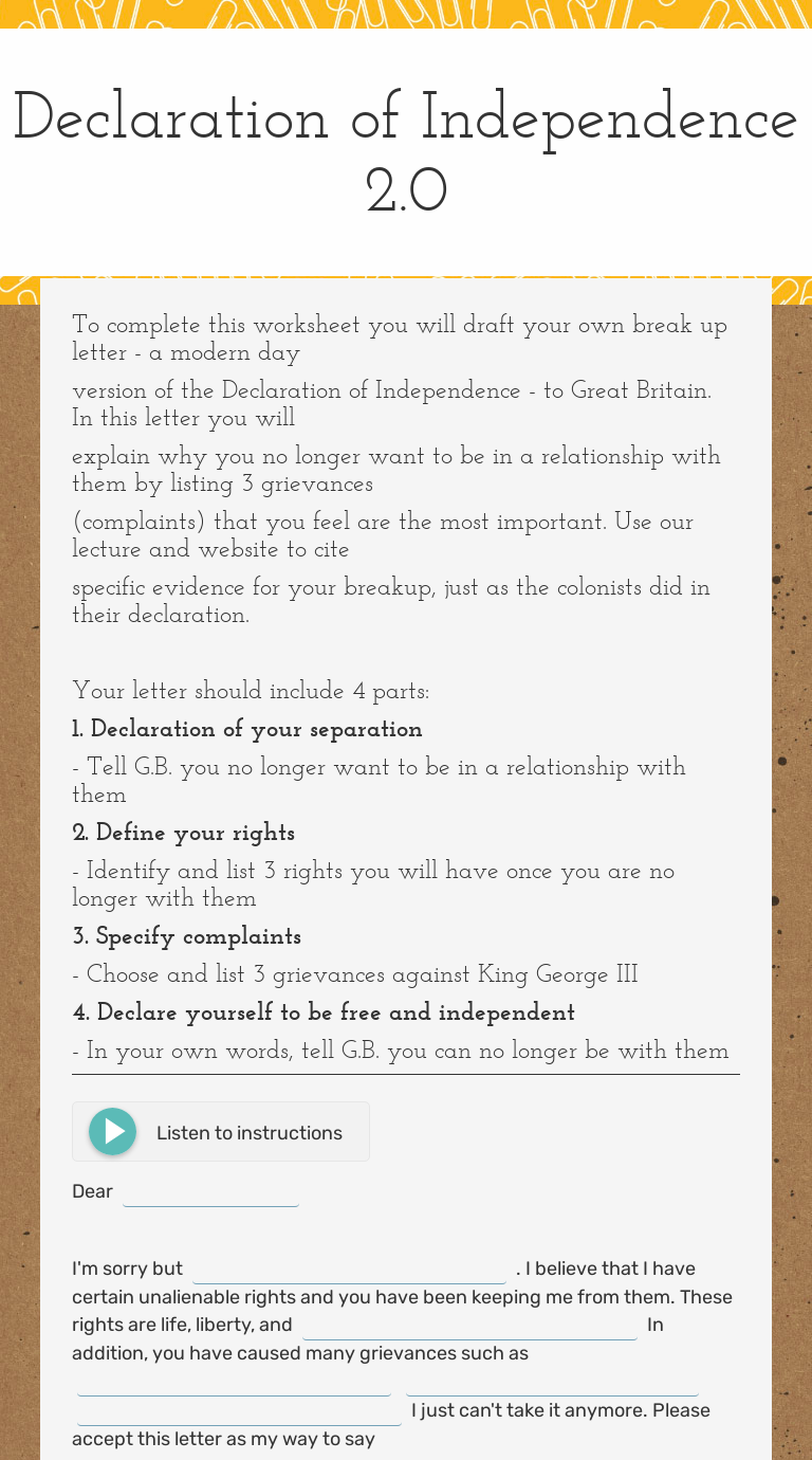 PDF Declaration of Independence Lesson Plan - Weebly Hand out Grievances worksheet and have students complete in pairs. Explain to students that most of the Declaration of Independence is a list of complaints against the King of England. They can find the original grievances in their textbook. The grievances on this worksheet have been combined and re-worded. Declaration of Independence