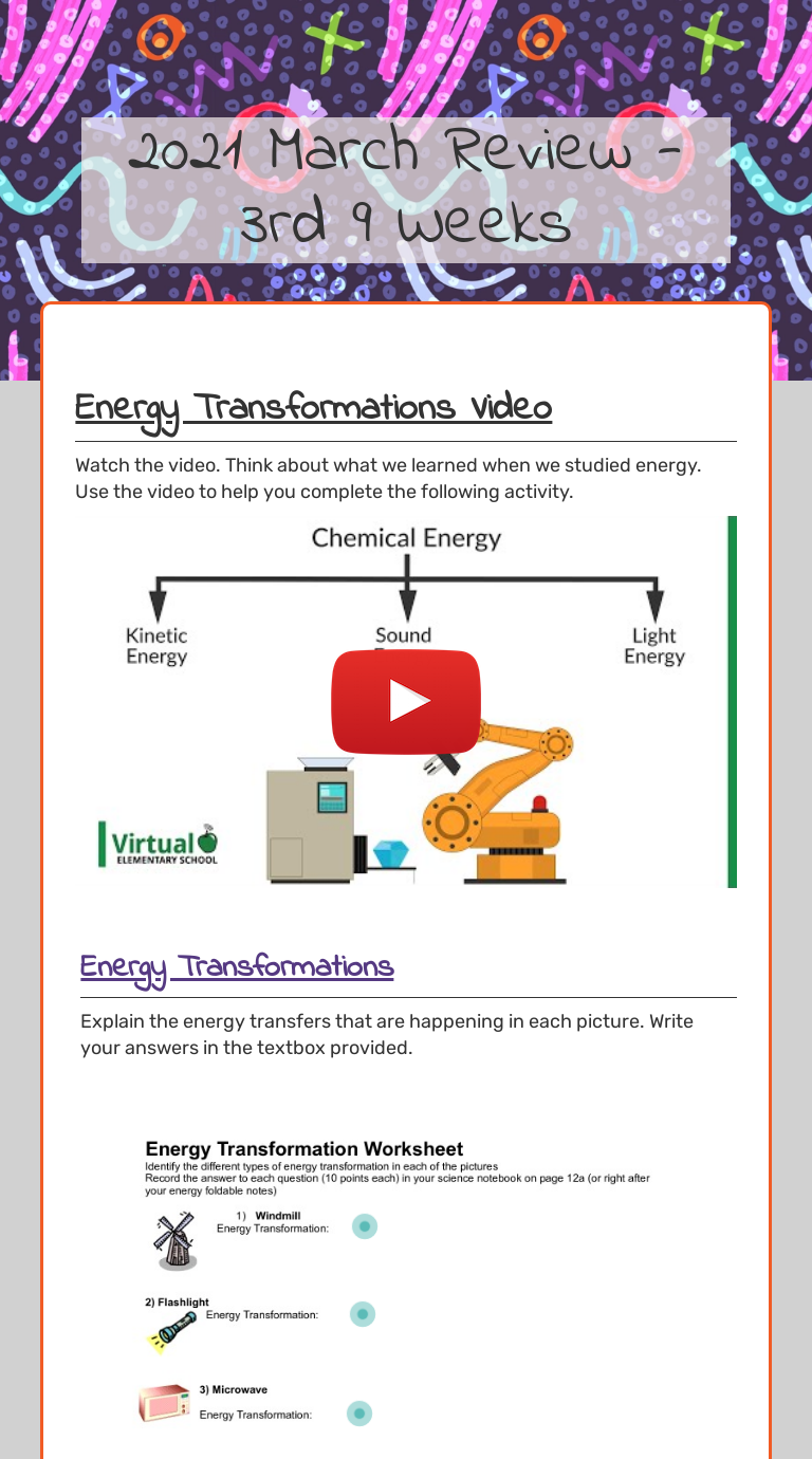 Energy Transformation Worksheet Answer Ky. Energy Transformation Worksheet. Identify the different types of energy transformation in each of the pictures. Windmill. Flashlight. Microwave.1 page