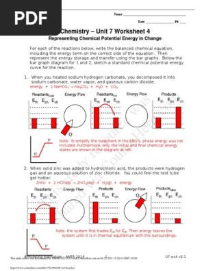 09-ws4.doc - Name Date Pd Chemistry - Unit 7 Worksheet 4 ... This preview shows page 1 - 4 out of 4 pages. View full document. Name Date Pd Chemistry - Unit 7 Worksheet 4 Representing Chemical Potential Energy in Change For each of the reactions below, write the balanced chemical equation, including the energy term on the correct side of the equation. Then represent the energy storage and transfer using the bar graphs.