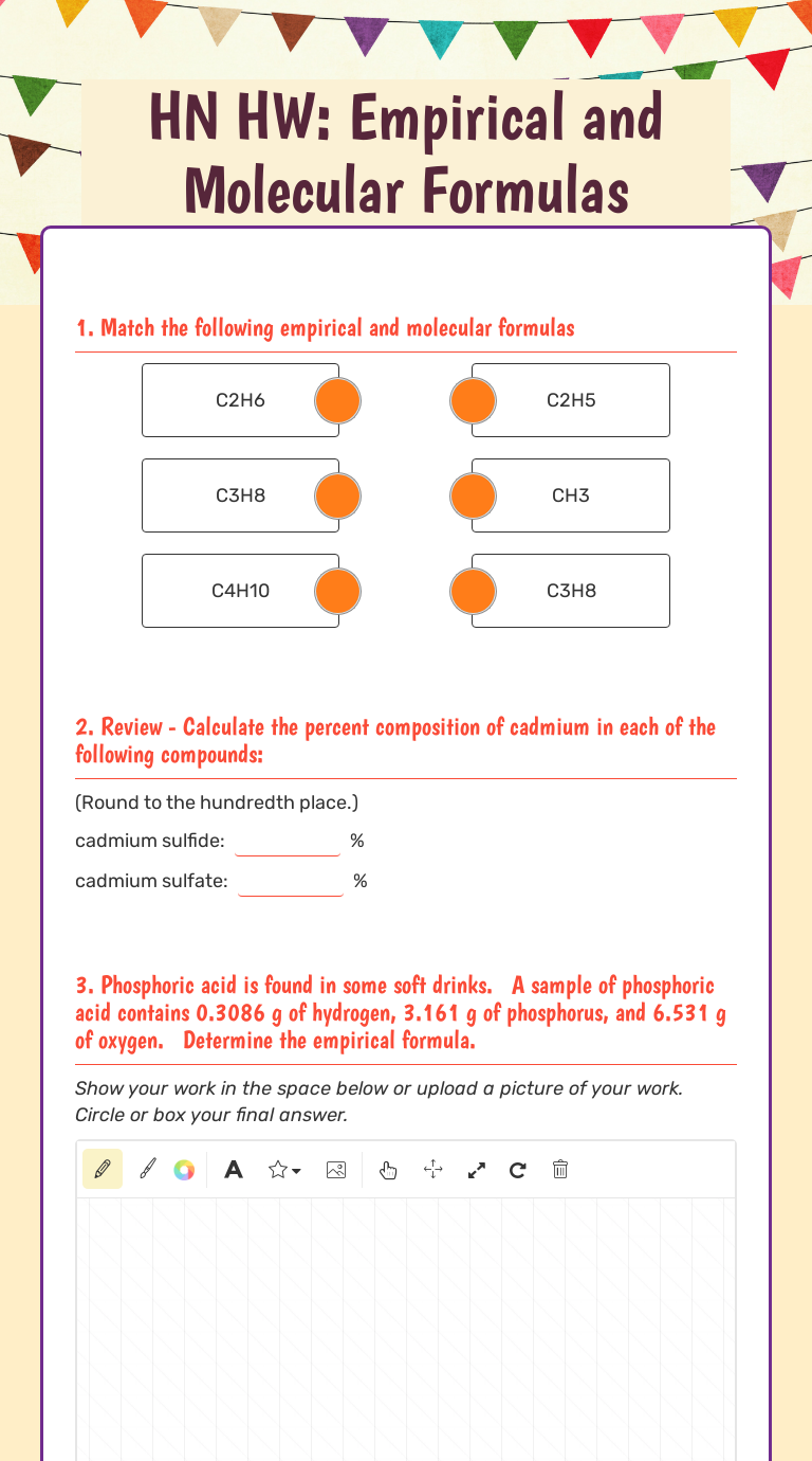 Percent Composition and Molecular Formula Worksheet -. ...and Molecular Formula Worksheet1.What's the empirical formula of a molecule containing 65.5% carbon, 5.5% hydrogen, and 29.0% oxygen?2.If the molar mass of the compound in problem 1 is 110 grams/mole, what's the molecular formula?3.What's the empirical formula of a molecule... Empirical and Molecular Formulas Worksheet Some of the worksheets displayed are Empirical and molecular formula work, Empirical and molecular formulas work, Chemistry, , Empirical formula work, Work 8 empirical formulas h o n o 4i, Compound names and formulas work three, Chemical formula writing work two.