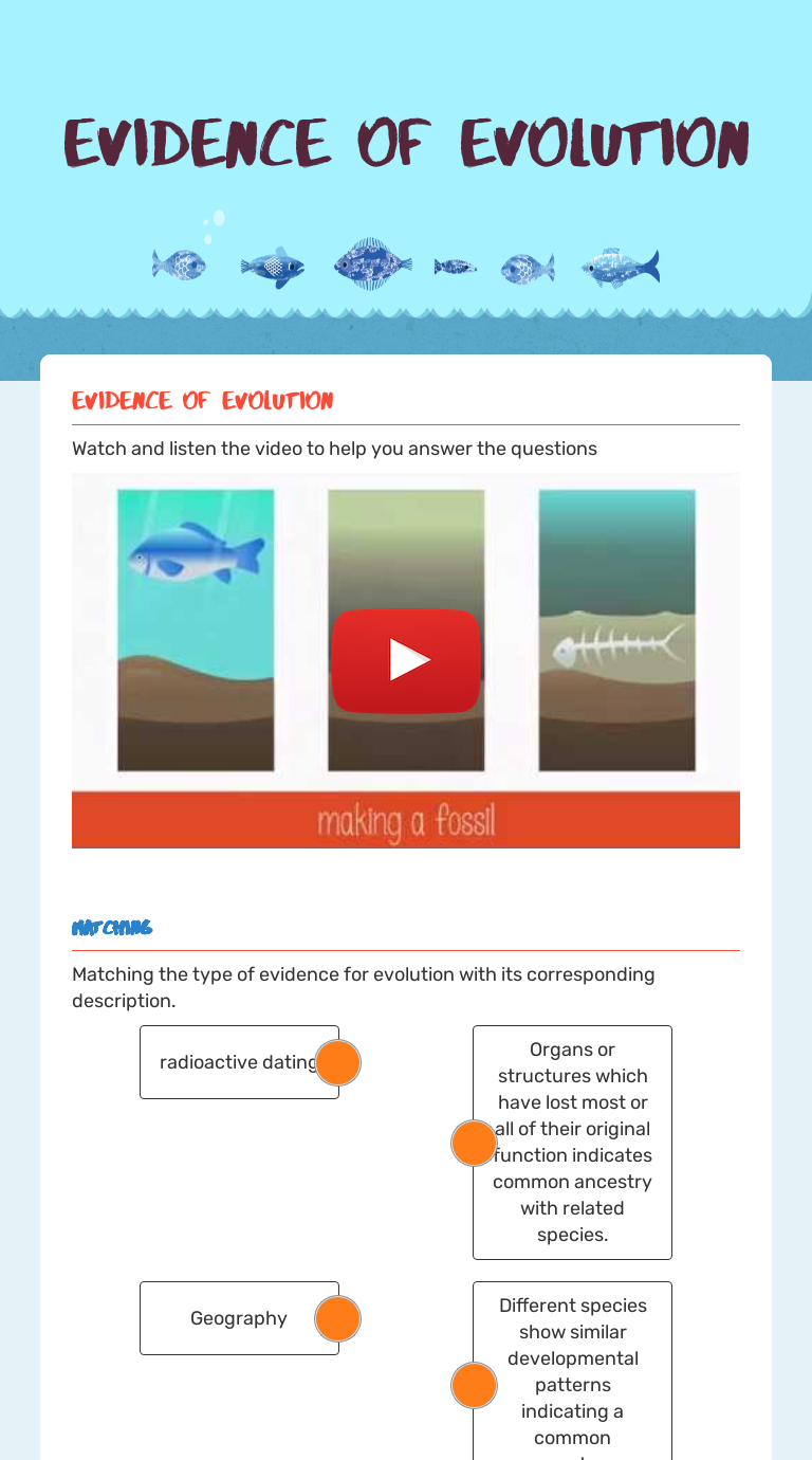 Evidence Of Evolution Teaching Resources | Teachers Pay ... Evidence of Evolution Stations. by. BioHero. 52. $4.00. PDF. Get your students fully engaged as they travel on a journey to examine fossil evidence, discover how relative dating and radiometric dating work, compare homologous and vestigial structures, embryological evidence, analyze DNA evidence, research antibiotic resistance with a webquest ...