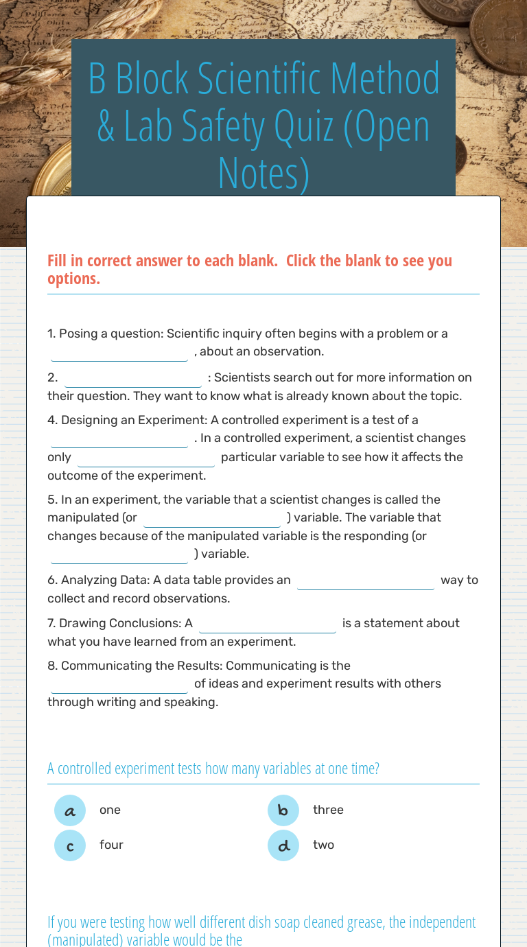 Scientific method quiz worksheet. The Scientific Method Quiz Home > Quizzes > Science Quizzes > scientific method : The Scientific Method Quiz. It will also review the different variables that the scientific method uses. By the end of the quiz, you should be able to distinguish between independent, controlled, and dependent variables. fullexams.com › exam › brainpop-quiz-answer-keyBrainpop Quiz Answer Key - fullexams.com Students can complete quizzes at newsela.com or on the Newsela mobile app. ^Quiz Answer Keys #omit-nav. Teachers can always view answer keys, and students see answer keys after submitting their quiz. To view answer keys from a teacher account, follow these steps: Go to an article and select the level for which you want to see the quiz answer key. 2 › jrt004 › bart-simpson-controlsBart Simpson Controls And Variables With Answers Sep 05, 2009 · Scientific method variables (worksheet) Moira Whitehouse. Spongebob Controls Variables jrt004. simpsons scientific method ... BI 101 Unit 1 Quiz AbrahamNolitos. Grade ... study.com › learn › lessonWhat is the Scientific Method in Psychology? - Steps ... Aug 21, 2021 · The Scientific Method and Psychology. The scientific method is a process used by researchers to examine whether a relationship between two or more variables exists. Psychologists and other ...