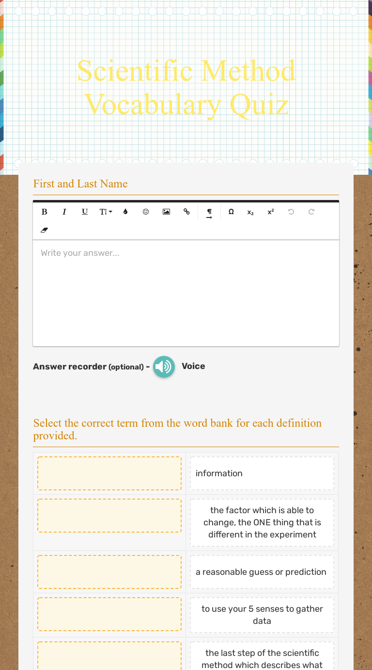 Quizmoz - Scientific Method Quiz, Scientific Method Fcats Quiz Coverage : The Scientific Method Quiz tests your knowledge about experiments in biology. 1. Scientifically-testable statements that can be Think you know more about Scientific Method and would like others to know too? Whether its a great fact, a joke, a personal experience or an interesting... Scientific Method Quiz - Scientific Method Worksheets - SoD Scientific Method Quiz. Check out 'Scientific Method Quiz', our free scientific method worksheet for kids! You can view, download, or print it here. Scientific Method worksheets and online exercises Live worksheets > English > Science > Scientific Method. Scientific Method worksheets and online exercises Language: English Subject: Science. Scientific Method Quiz | Interactive Worksheet by... | Wizer.me Scientific Method Quiz Worksheet. August 14, 2020. Impact. The group kept under normal circumstances; used as a comparison. Controls. the last step of the Scientific Method where you summarize it all and what you learned.