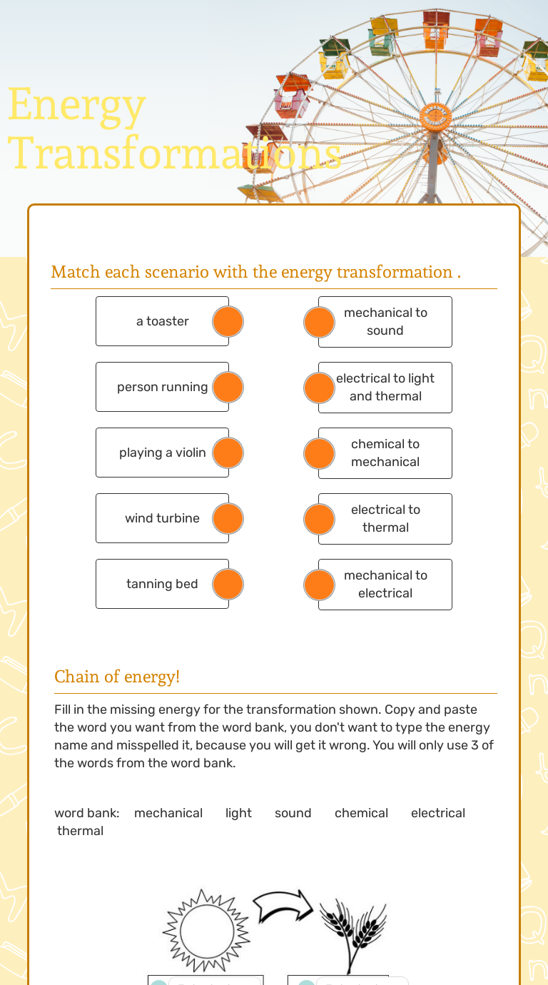 Rate the energy transformations worksheet answer key | signNow Energy Transformations Worksheet. Get your fillable template and complete it online using the instructions Use this step-by-step guideline to fill out the Energy transformations and conservation answer key swiftly Instructions and help about energy transformation worksheet pdf with answers.