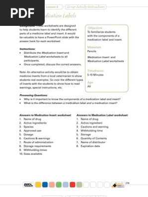Reading Medication Labels Worksheet - Sixteenth Streets Reading Medication Labels Worksheet. • know the importance of reading and understanding all of the information on the drug facts label. Reading medicine labels 2 worksheet. Prescription Label worksheet from Participant with a copy of the medication label and medication insert label. Additional labels for additional products can be sought from a veterinarian to Reading Medication Labels Worksheets - Lesson Worksheets Worksheets are Adult learner health literacy curriculum program 11, Reading medicine labels student work, Putting science into animal science projects area, Reading medicine labels lesson plan, Livestock injection methods placement, Drug safety reading labels and patient information, Medicine a, Questions to encourage consumer inquiry. Medicine Labels worksheet ID: 182348 Language: English School subject: English as a Second Language (ESL) Grade/level: Level 2 Age: 18+ Main content: Health Other contents: Add to my workbooks (16) Download file pdf Embed in my website or blog Add to Google Classroom Reading Medication Labels Teaching Resources | Teachers ... Reading medication labels is an important skill for anyone who chooses a career in healthcare, as well as anyone who might take medication some day. Medication labels tell us important pieces of information, including expiration date, warnings, normal adult dosage, dosage strength, etc. For this activity, students will pair up and look at ...