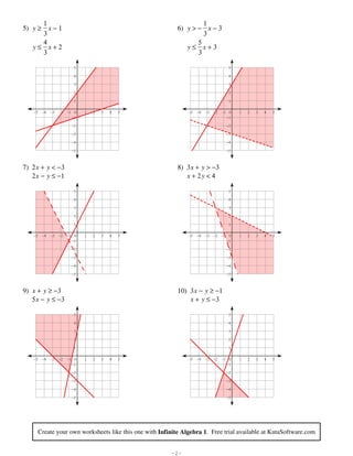 PDF Systems of Inequalities - cdn.kutasoftware.com 13) State one solution to the system y < 2x − 1 y ≥ 10 − x Many solutions. Ex: (10 , 10) or (5, 8) 14) Write a system of inequalities whose solution is the set of all points in quadrant I not including the axes. x > 0, y > 0-3-Create your own worksheets like this one with Infinite Algebra 2. Free trial available at KutaSoftware.com
