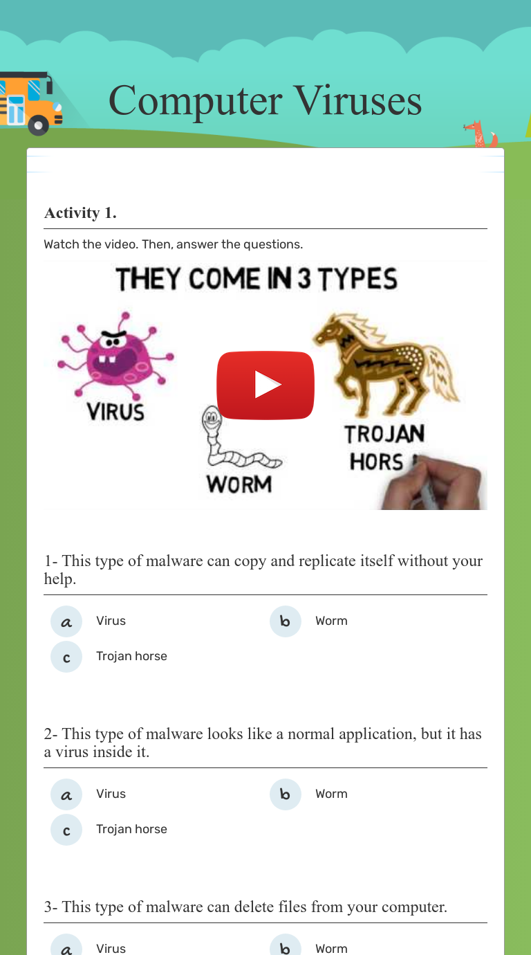 VIRUS WORKSHEET ANSWERS. - ppt download Virus worksheet answers. Published by Kelly Perry Modified over 3 years ago. Presentation transcript: 1 virus worksheet answers. 2 1. Mad Cow Disease N Bovine spongiform encephalopathy (BSE) Mad Cow Disease Youtube (2:32) CJD Youtube (8:21) Note sponge-like... hhmi virus explorer worksheet answer key | Best Cheap .. Virus-explorer-worksheet. University Germanna Community College; Course General Biology II (BIO 102) ... Click on these icons and answer the questions below associated with each viral characteristic. Listing Of Websites About virus explorer worksheet answer key. Share this PDF Coronavirus (COVID-19) Facts and Advice | Who can get the virus? In this COVID-19 worksheet, students learn vocabulary related to coronavirus as well as the latest facts and advice about the virus. Exercise C - Answer key. 1. It was first reported in Wuhan City in China. 2. T hrough contact with droplets from an infected person's. Computer Viruses Worksheet Teach your class or revise on the dangers of computer viruses. It contains 4 interactive tasks. Here they are: Task 1 - Fill in the gaps on Computer Viruses! Task 2 - Create a poster on viruses using the information above. Task 3 - Draw a drawing of a cartoon virus. Use a pencil! (Use the space below).