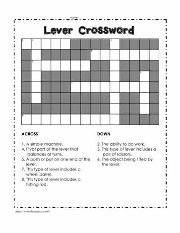 Crossword Puzzle Weebly - ame.americansamoa.gov CrosswordPuzzle Across 1. tool with two levers attached together for cutting paper 5. wheel and axle device that is turned when you open a door 6. wedge used for cutting food 8. fixed point on a lever that doesn't move 10. number of different types of simple machines 11. type of simple machine that is made of a wheel with a rope or chain 13.