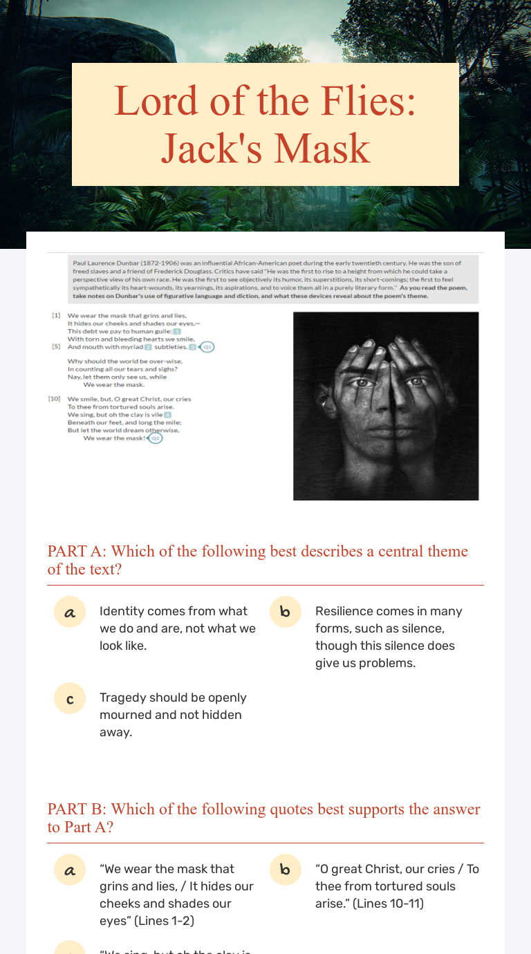 We Wear the Mask Lesson Plan by Giavonni Gray - Prezi Materials: For this lesson a copy of the poem "We Wear the Mask", copies of the activities, and quizzes are all needed. -Day 1 the class will be reading the poem "We Wear the Mask" and doing a mental analysis to help prepare for Day 2. -Day 2 the class will work on an in class assignment where they are asked to create a chart listing ... We Wear the Mask Questions and Answers - eNotes.com 1 educator answer. We Wear the Mask. Name two things that the mask hides in "We Wear the Mask." In "We Wear the Mask," the speaker explains how the mask "hides our cheeks and shades our eyes ... The Masks We Wear (Both Physically And Figuratively) The Figurative Masks We Wear: We all know that we tend to talk differently depending on who we are with, whether it's family, friends, coworkers, etc. But it's not just how we talk, but how we act. I believe everyone one of us has been guilty of this at least once and can remember it. But it's not just how we talk like the words we use, but the ... We Wear the Mask.docx - Poem Worksheet The Theme of Racial ... Poem Worksheet The Theme of Racial Discrimination. In the poem "We Wear the Mask," Paul focuses primarily on the theme of racial prejudice, making elaboration in different lines regarding the oppression that African Americans underwent after the Civil War. According to the poet, African American community continued to suffer after the Civil War but were inclined to hide their true feelings ...