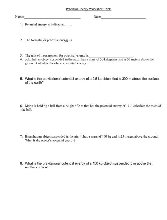 DOC Potential Energy Worksheet - karenmckenzie.weebly.com Calculate the objects potential energy. Mrs. Jacobs dropped an object from 10 meters. She knows it did 50 joules of work. How much did it weigh? 6 Maria is holding a ball from a height of 2 m that has the potential energy of 10 J, calculate the mass of the ball. Brian has an object suspended in the air.